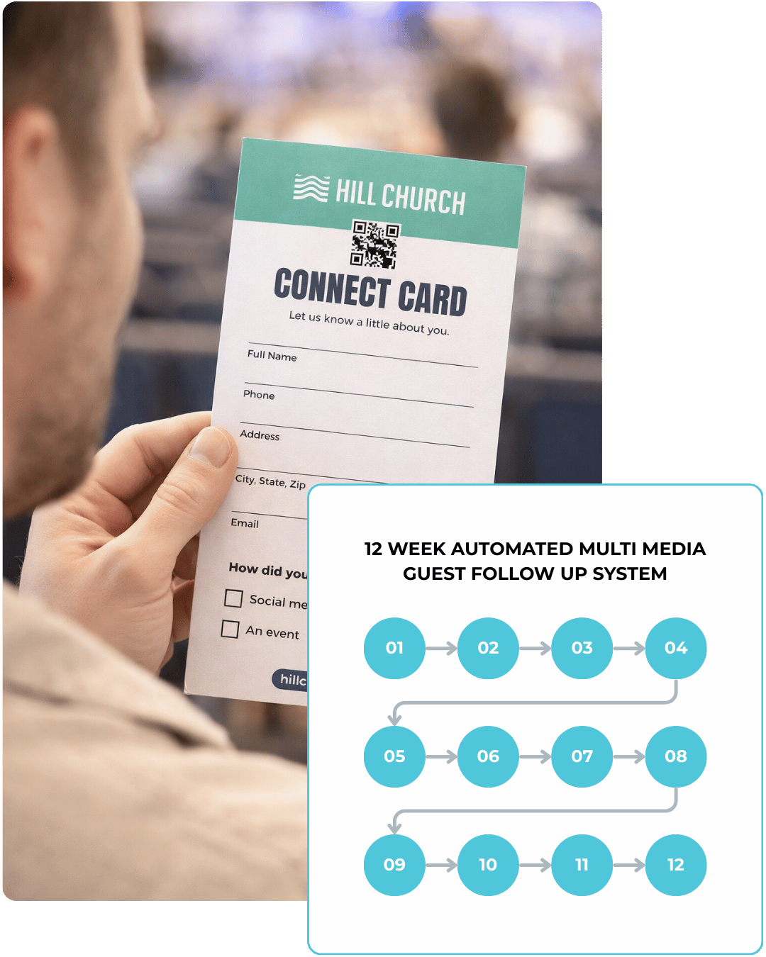 Instead of one follow-up message, your church builds a consistent connection over 12 weeks—helping more first-time guests return and become part of your church family.